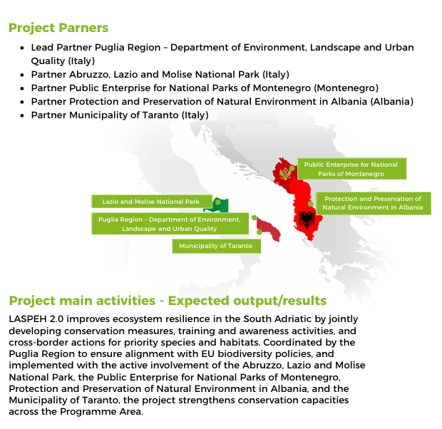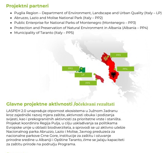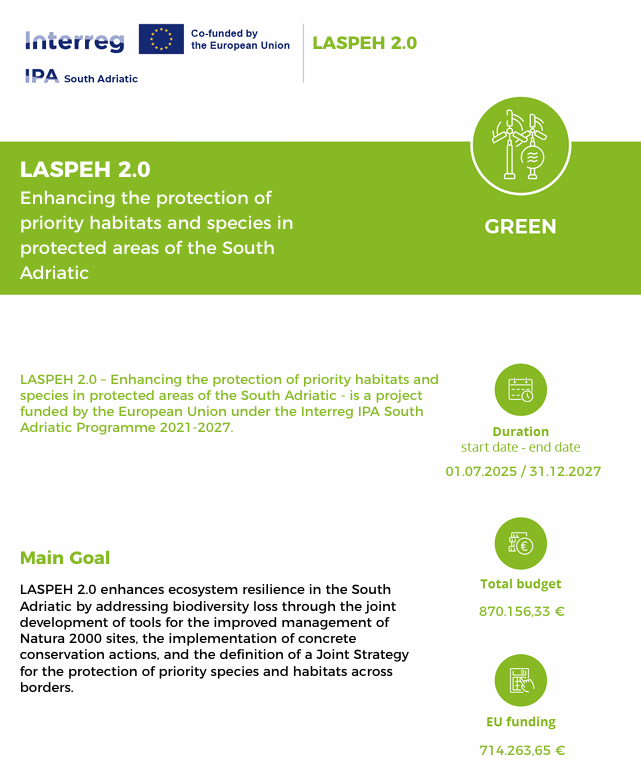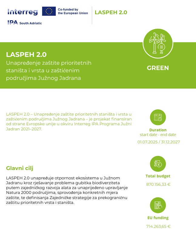 Projekt LASPEH 2.0, „Jačanje zaštite prioritetnih staništa i vrsta u zaštićenim područjima južnog Jadrana“, finansiran od strane Interreg VI-A IPA pro...